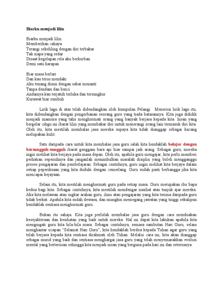 Wahai guru, kau ibarat sebatang lilin menerangi alam kegelapan kau sanggup membakar dirimu wahai guru, kau insan yang mulia mendidik dan membimbing daku . Kau curahkan bakti dan budi Keputusan peperiksaan · kau ibarat sebatang lilin 8.